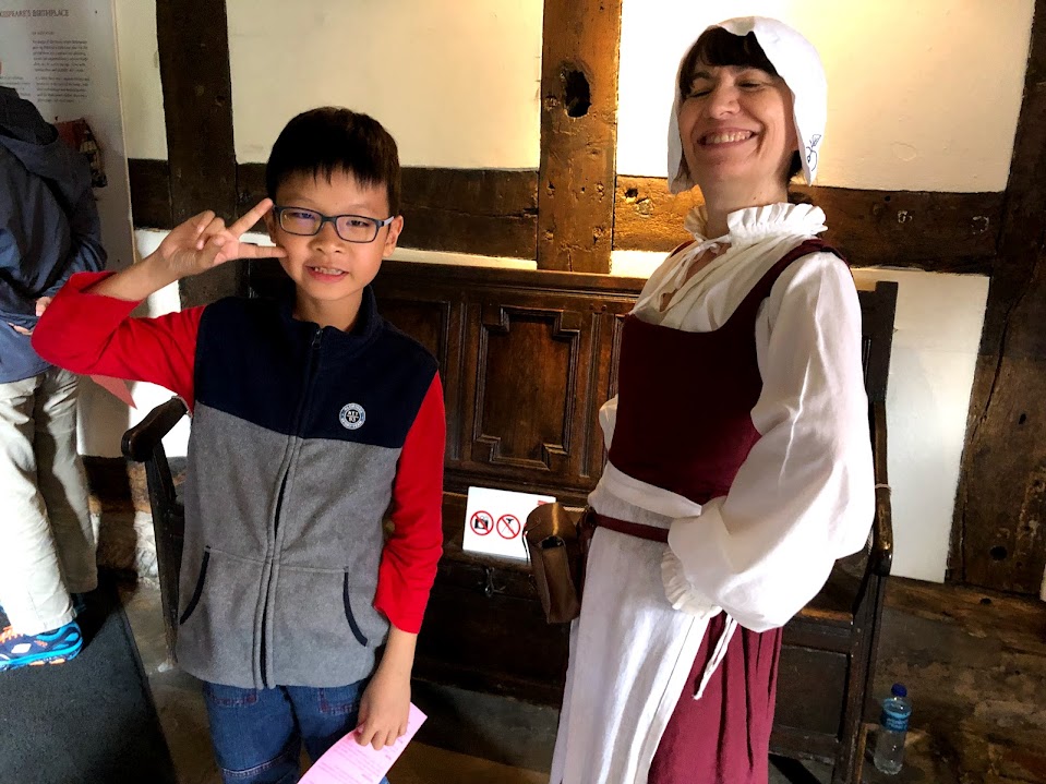 要進入莎士比亞的故居前,終於見識到莎士比亞的超人氣,門票買好後等了半個小時,才得以進入瞻仰莎翁的風采。莎翁的故居不僅將他生前的住所擺飾保留下來,還有人cosplay扮演莎翁的親人,給人一種穿越時光禭道回到過去的感覺。